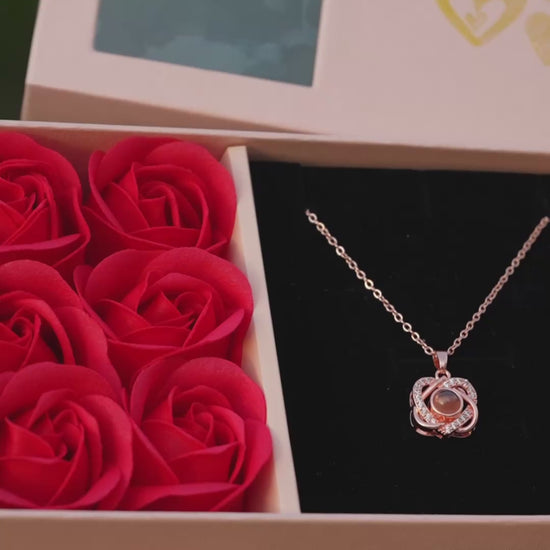 Boîte de roses éternelles avec son collier "Je t'aime en 100 langues"